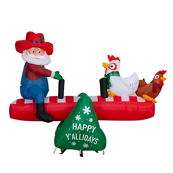 6ft Animated Santa As Farmer On Teeter Totter With Pullet And Rooster
